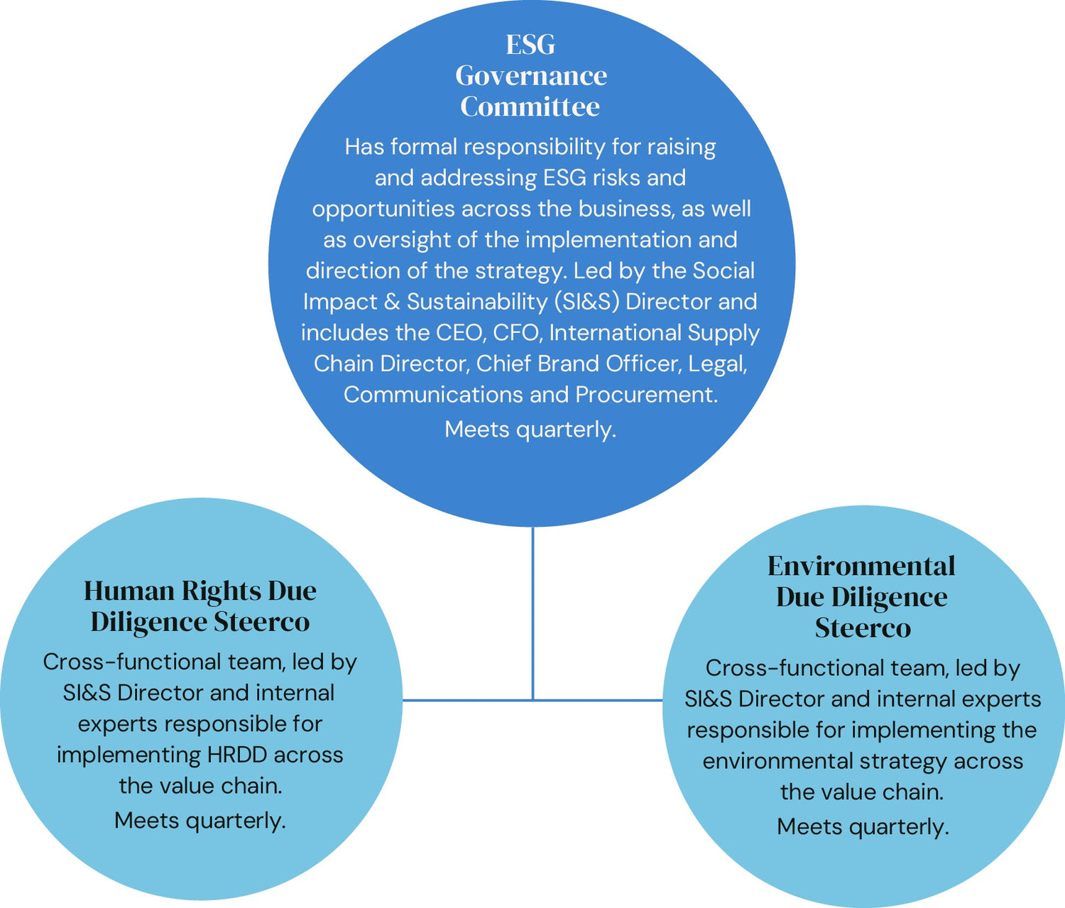 Our ESG Governance Committee meets quarterly to review risks and opportunities at Twinings and oversee our strategy. To help with this, Twinings has a Human Rights Due Diligence Steering Committee and an Environmental Steering Committee. They discuss progress and challenges, and raise risks identified through horizon scanning, stakeholder engagement and third-party research and insights.